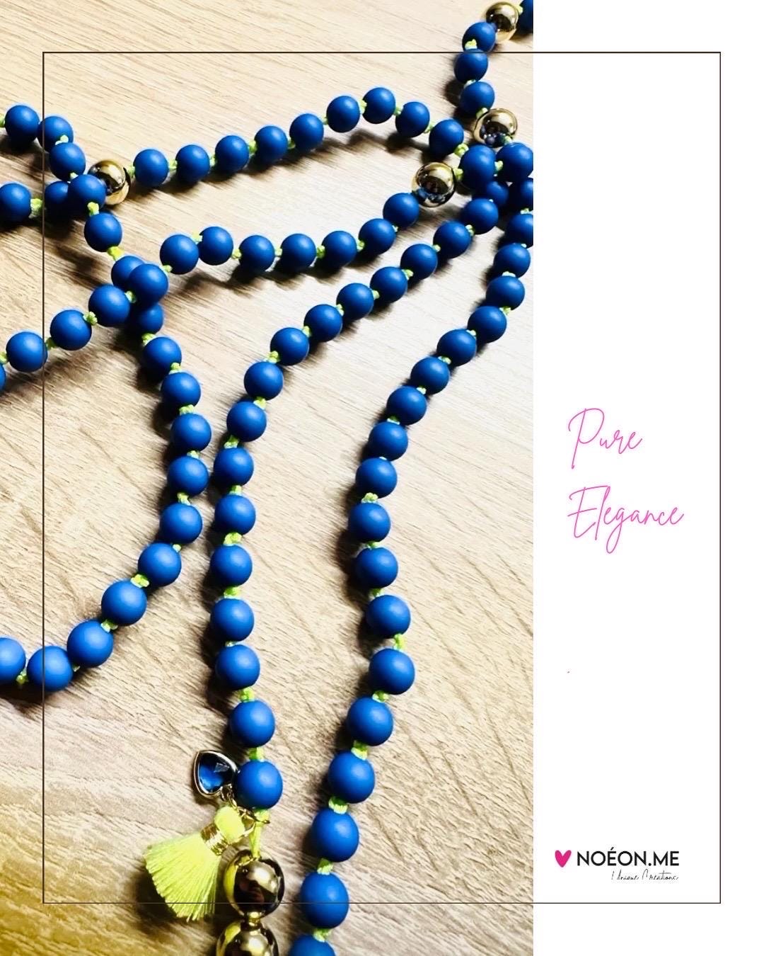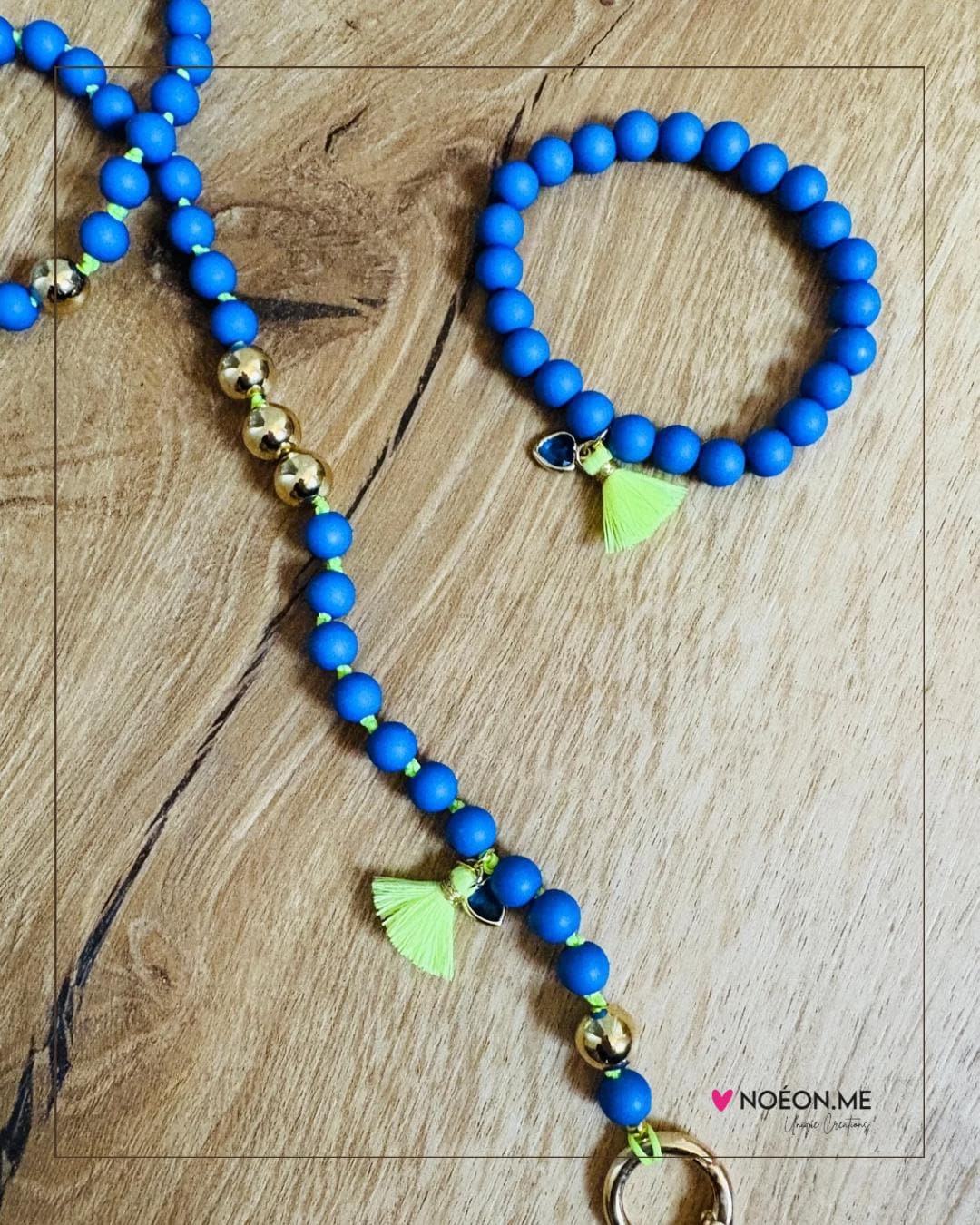 A true highlight: This handmade cell phone chain combines matte, royal blue acrylic beads (8 mm) with shiny gold accents. Small neon-colored tassels create a modern, fresh look.