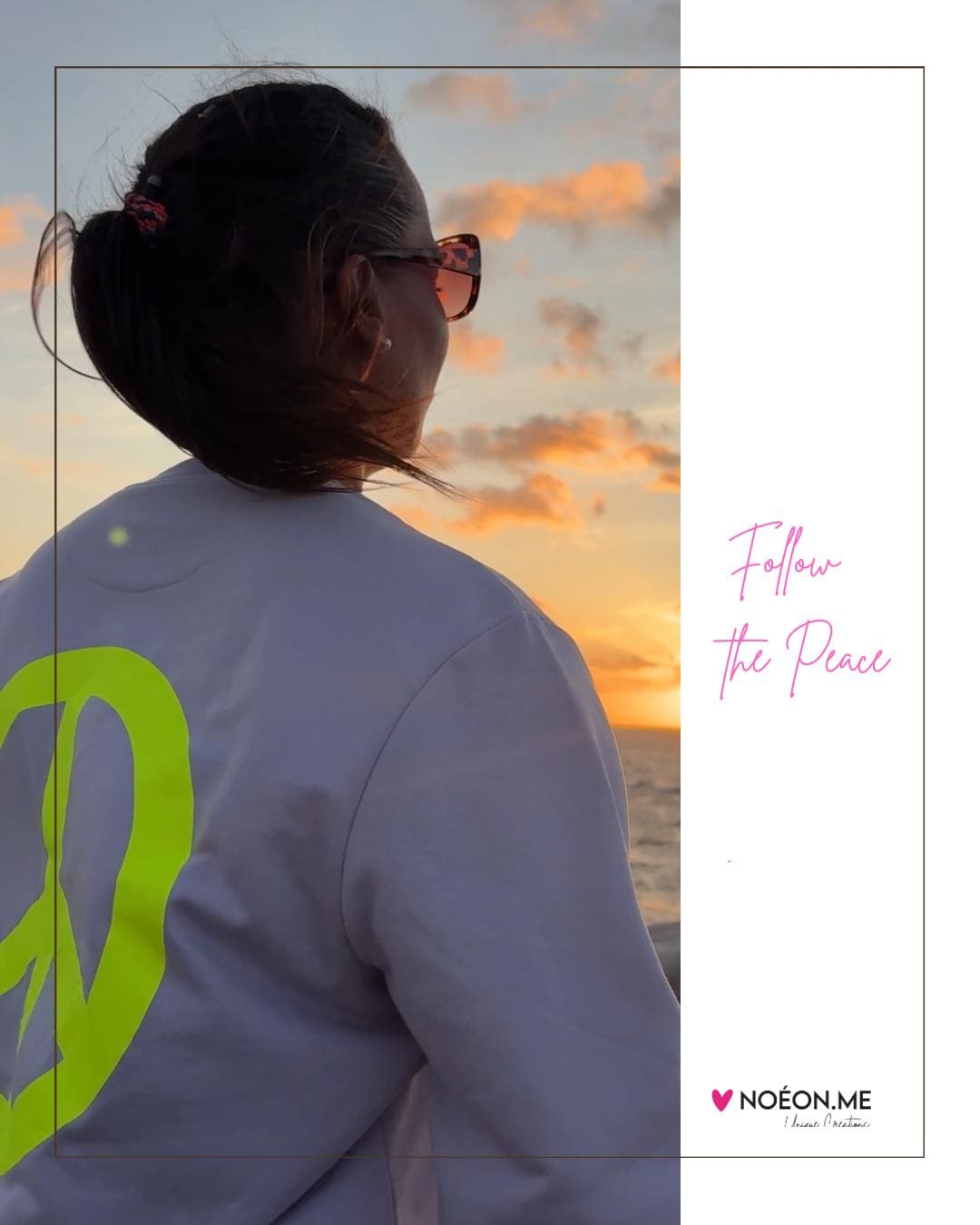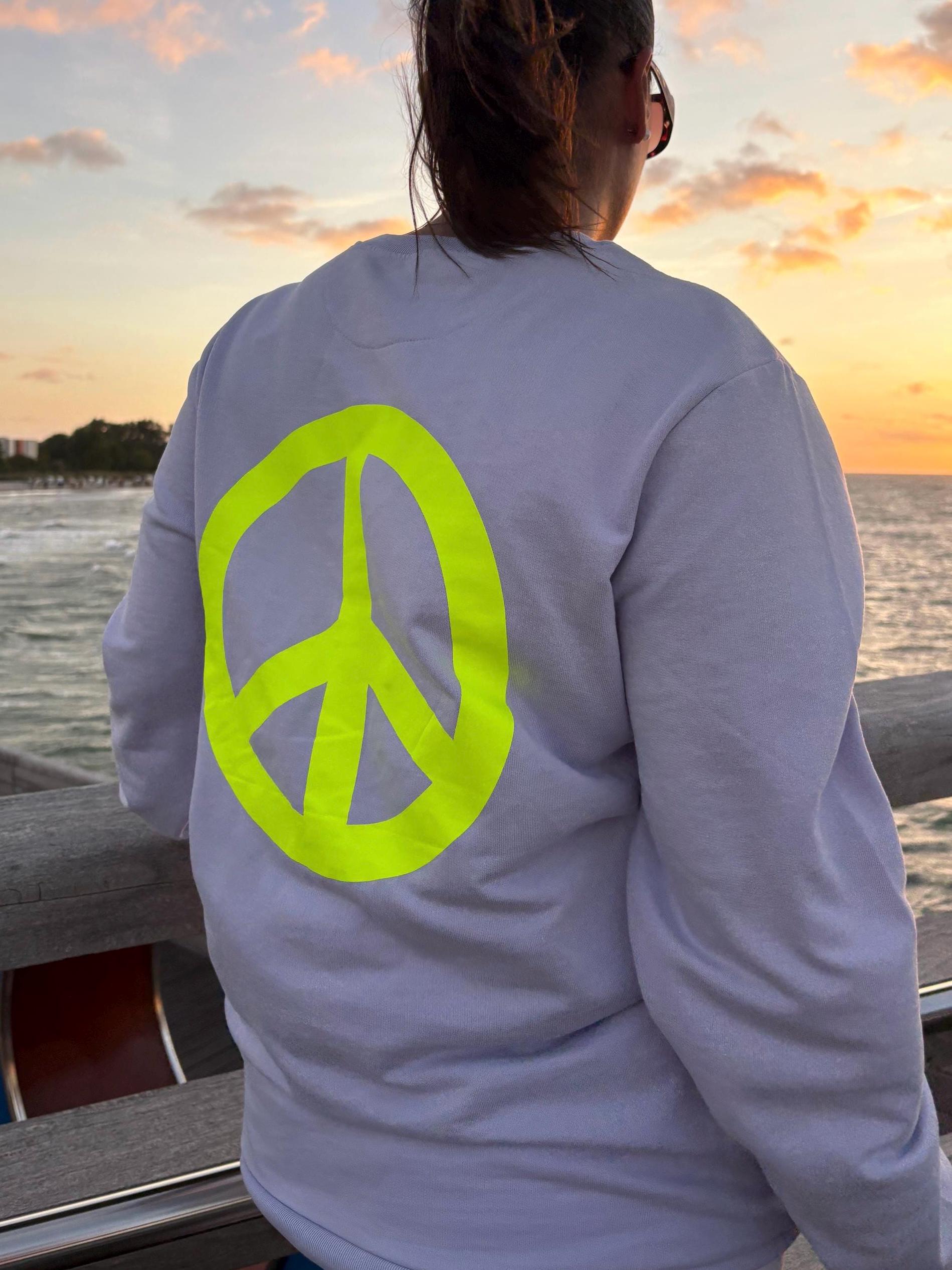 The peace sign can be designed in your desired color (e.g., neon pink, white, black, or pastel), and the sweater itself is also available in various basic colors.