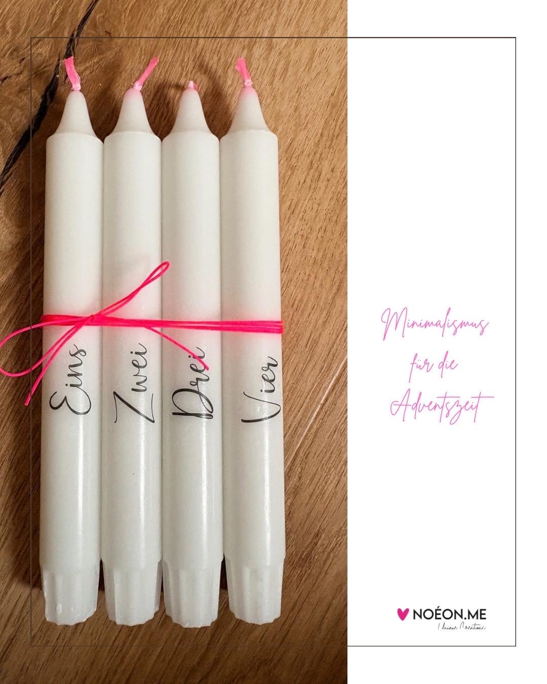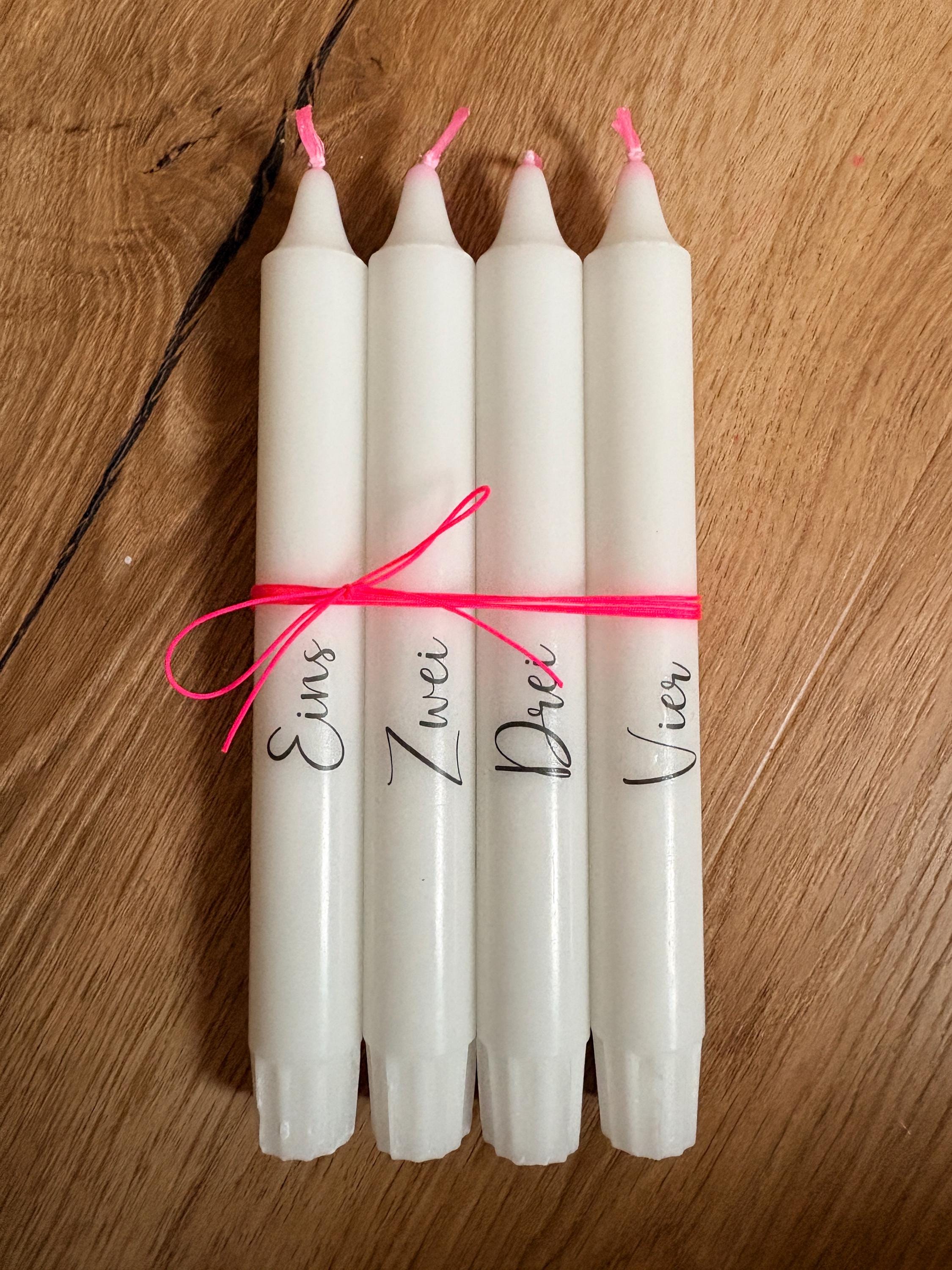 The four white candles are inscribed with the words One, Two, Three, Four in fine, black lettering and have a delicate pink wick that gives them a special, light color note.
